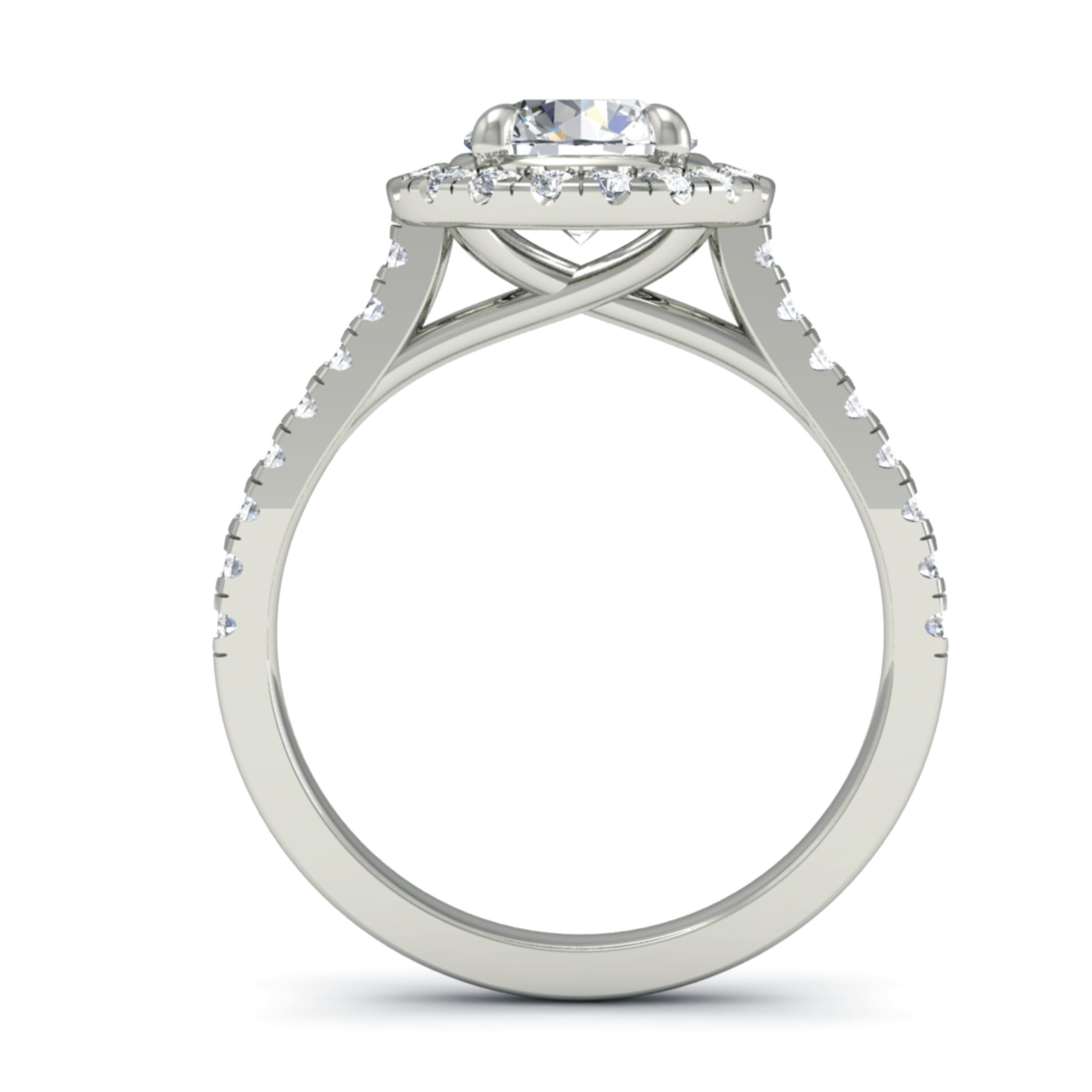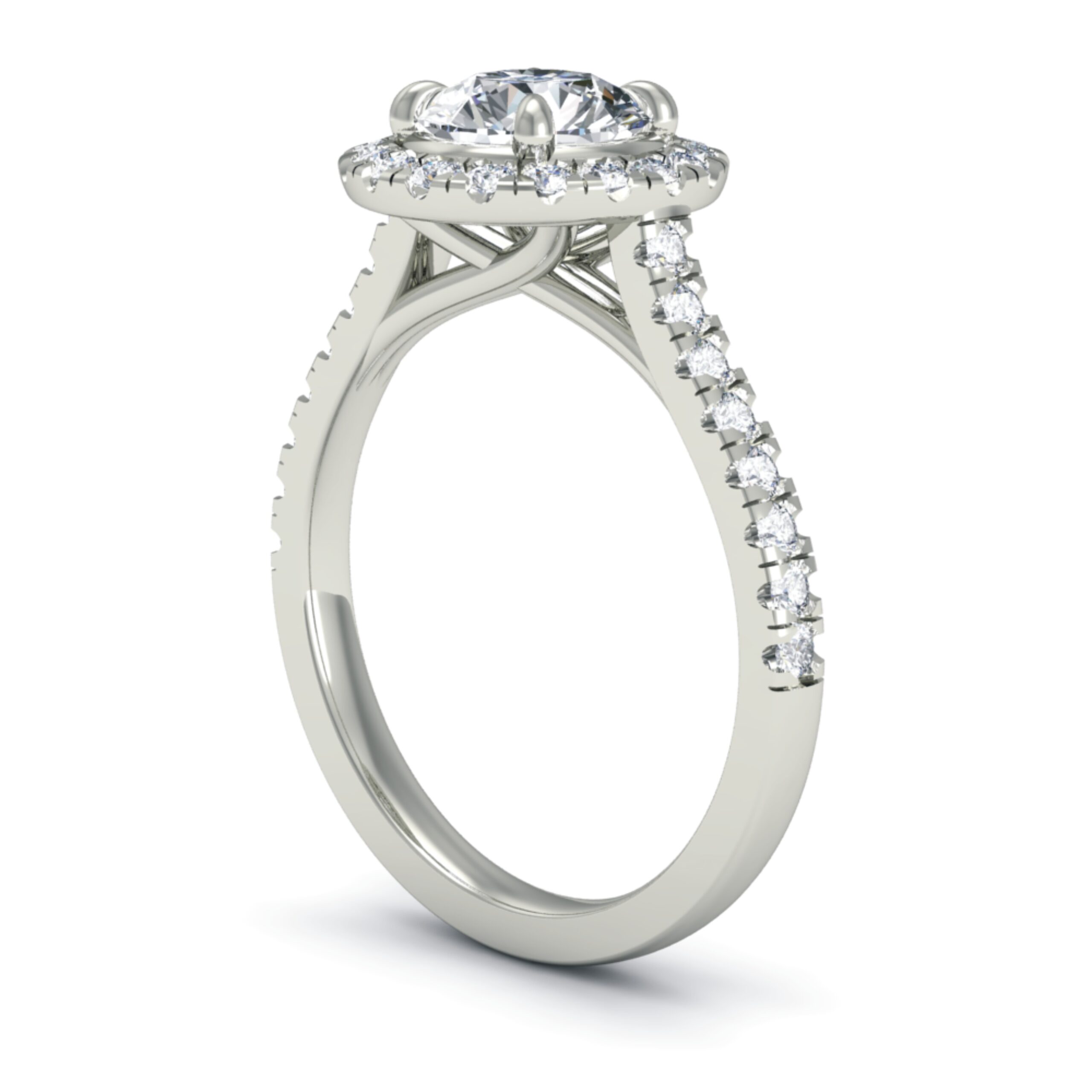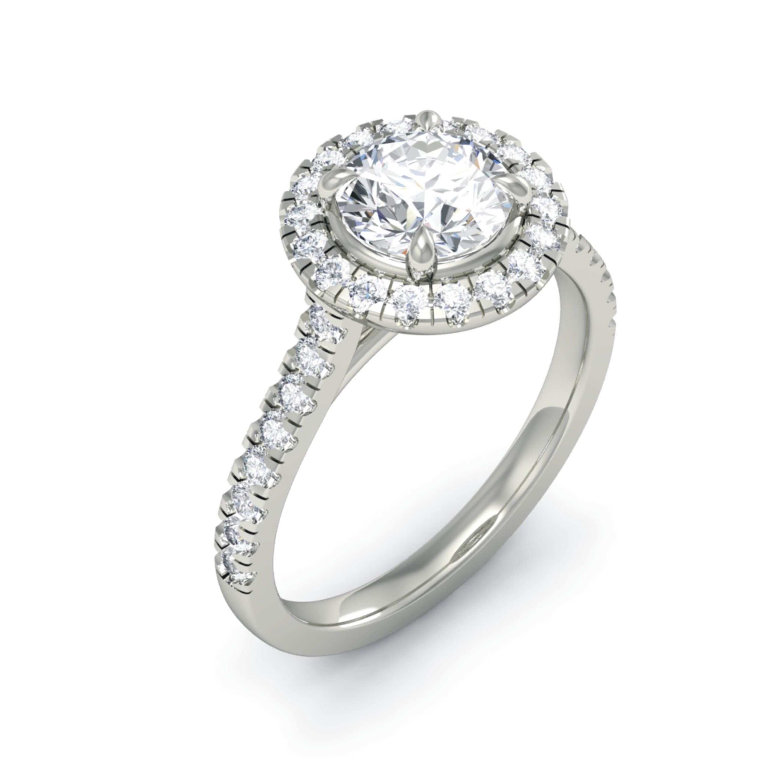 A dazzling celebration of light — this halo diamond ring features a brilliant-cut round centre stone, encircled by a radiant halo of smaller diamonds.
