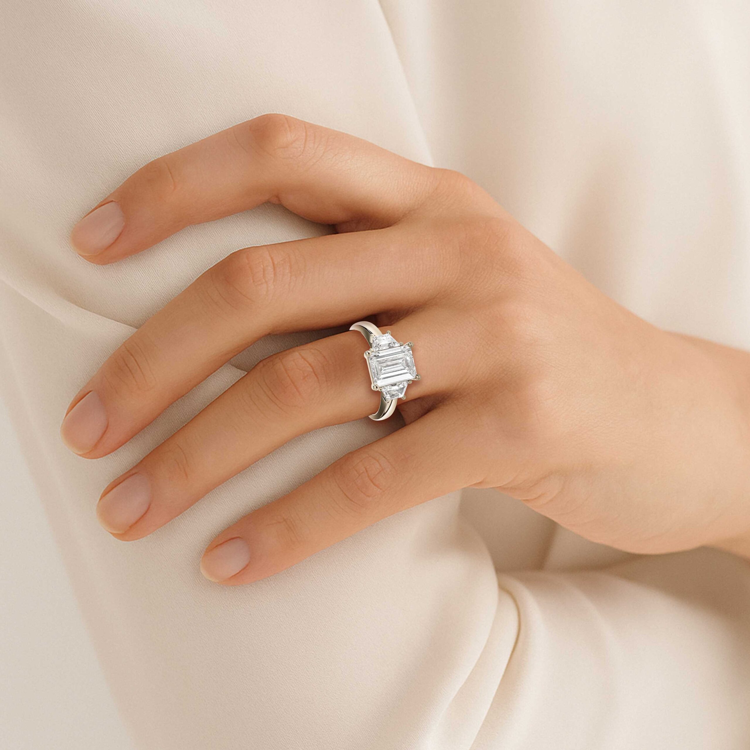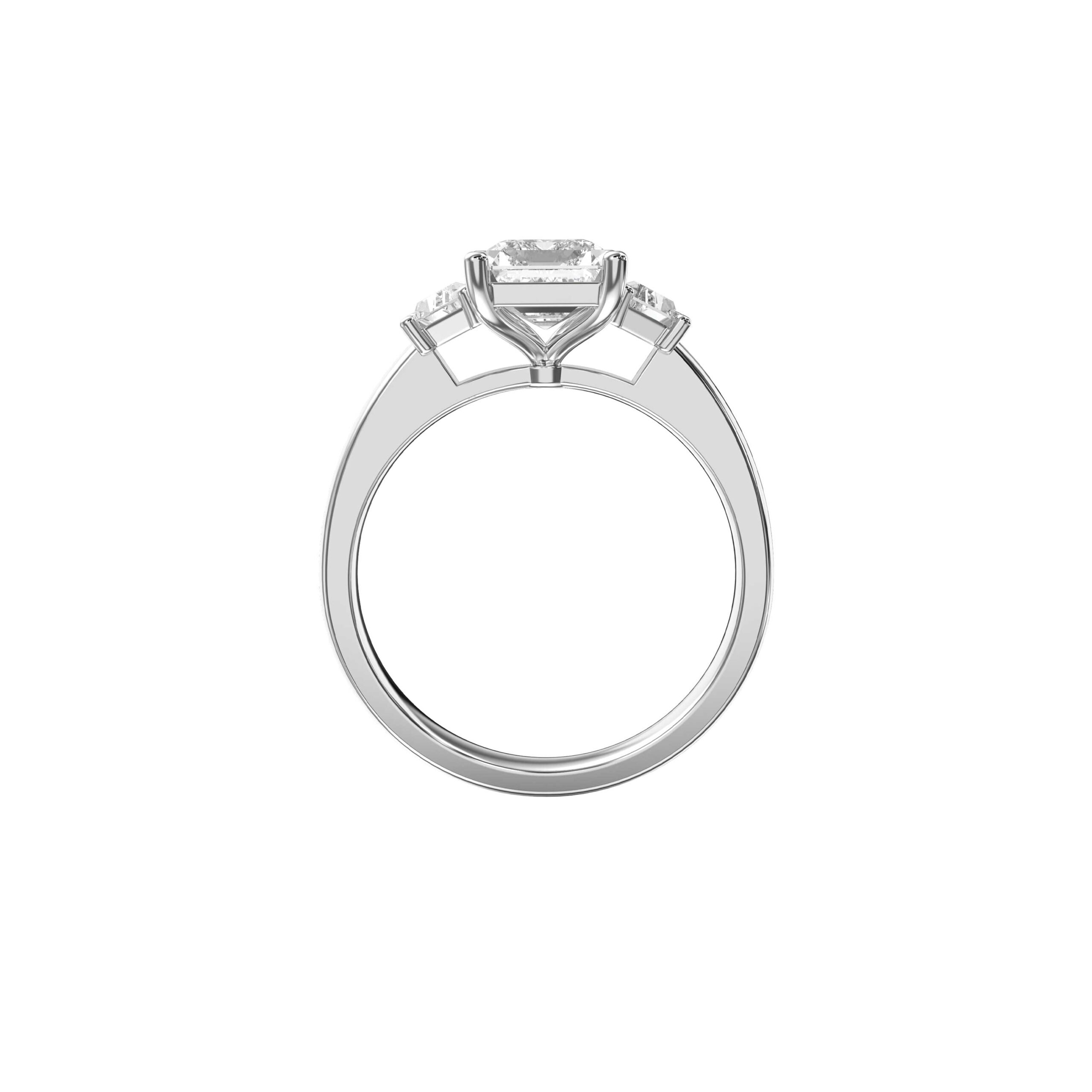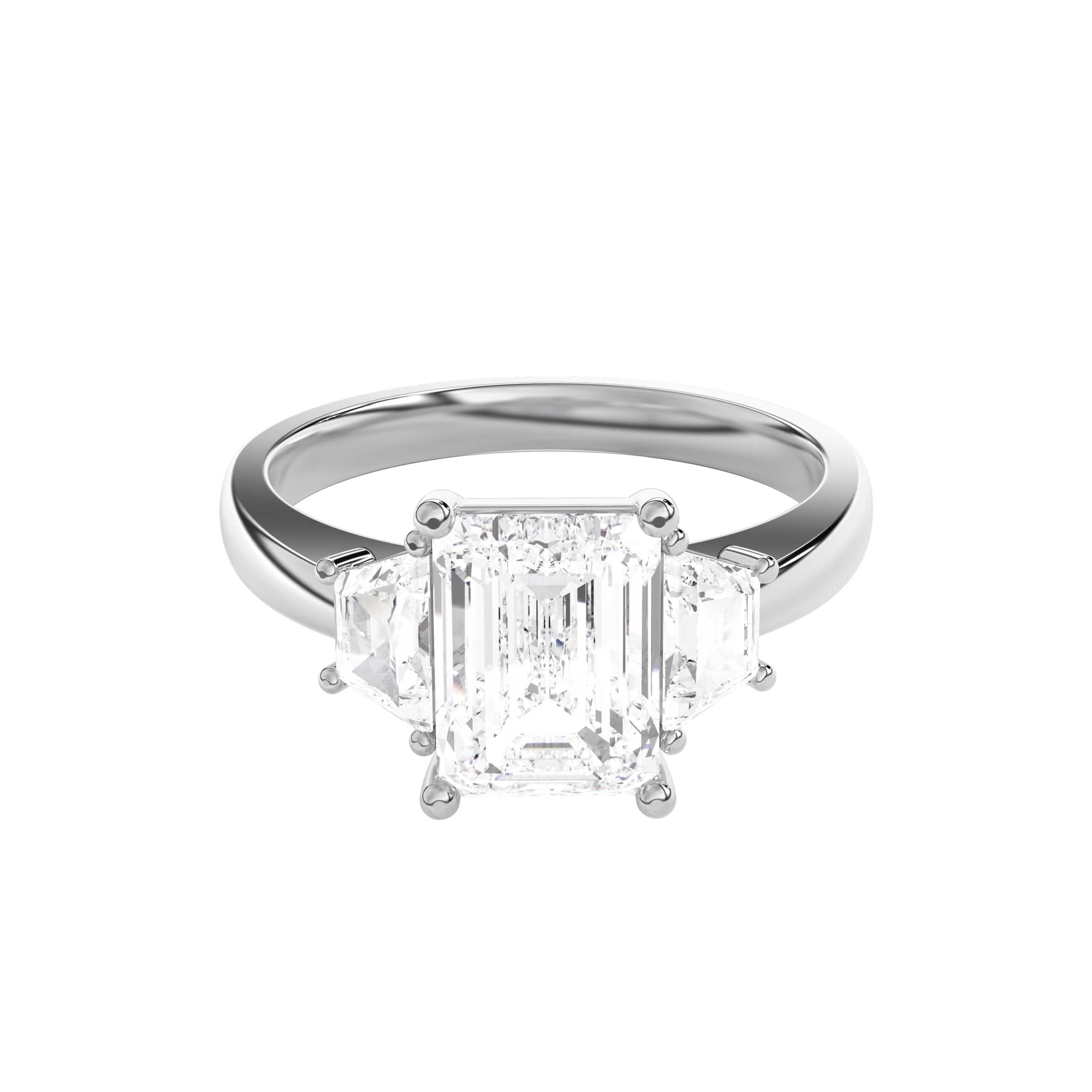 3 Stone Lab Diamond Ring with Emerald Cut Centre and Trapezoid Shoulder Diamonds in White Gold