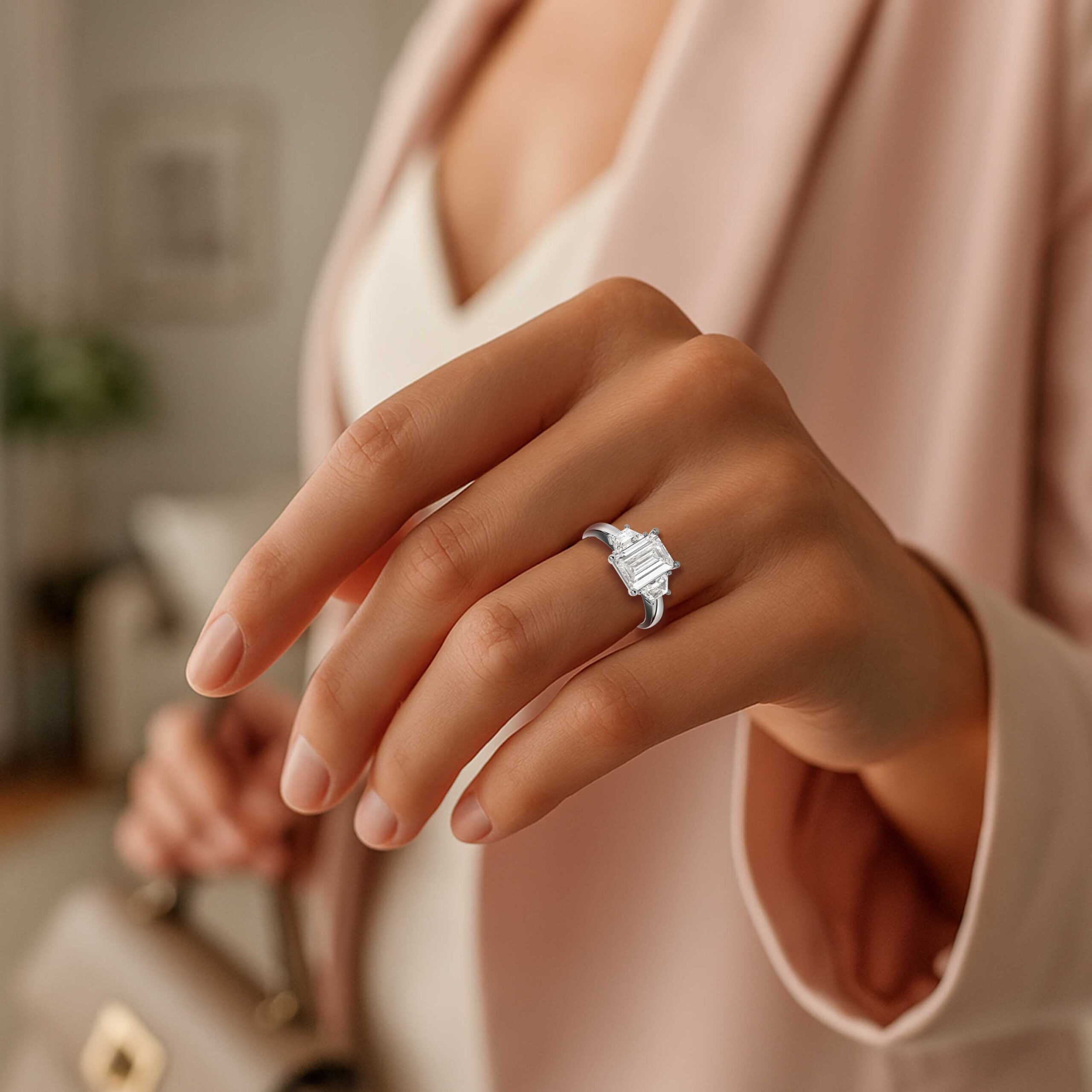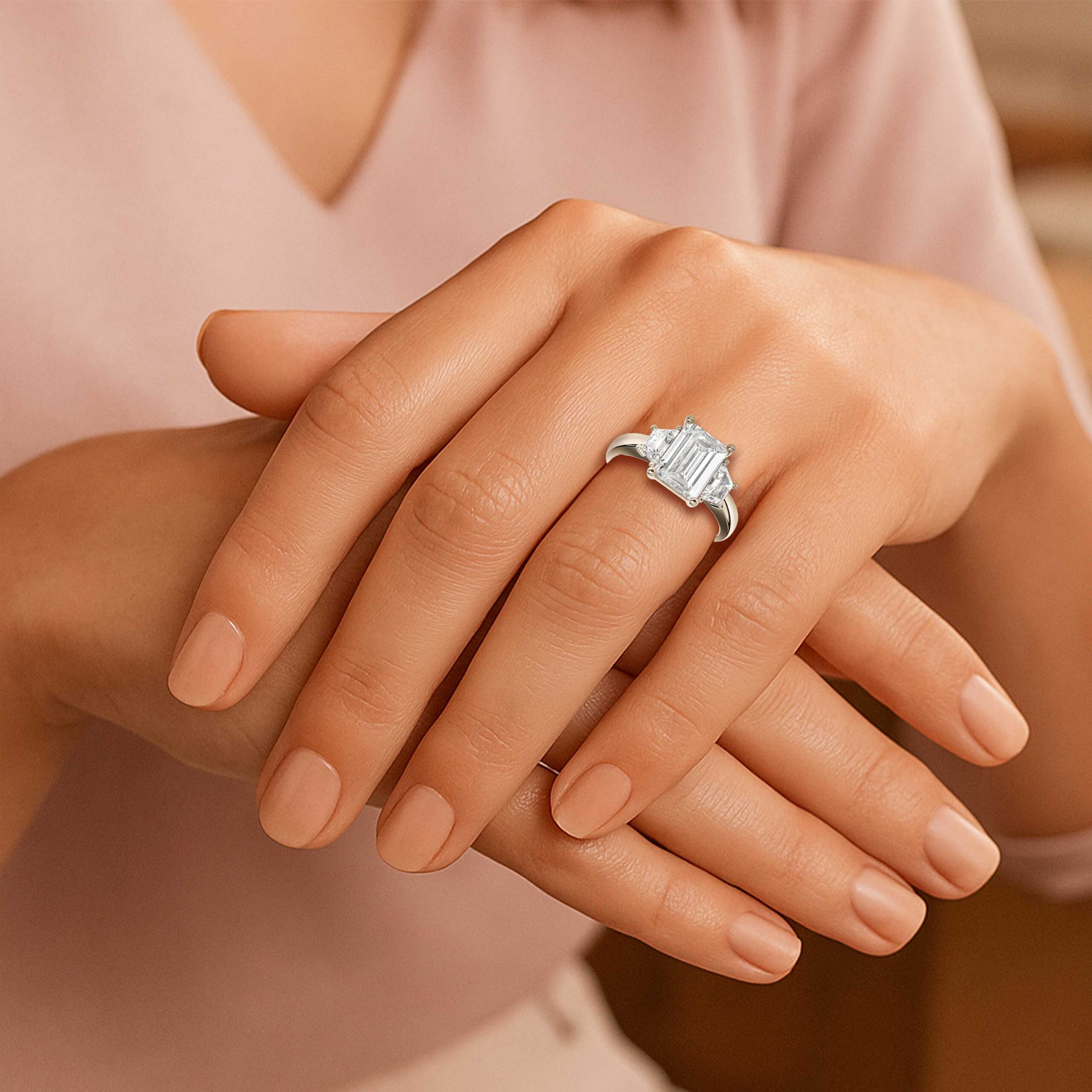 A modern classic with architectural elegance — this three-stone diamond ring showcases a dazzling 1.00ct radiant-cut centre stone, flanked by perfectly matched trapezoid-shaped diamonds.